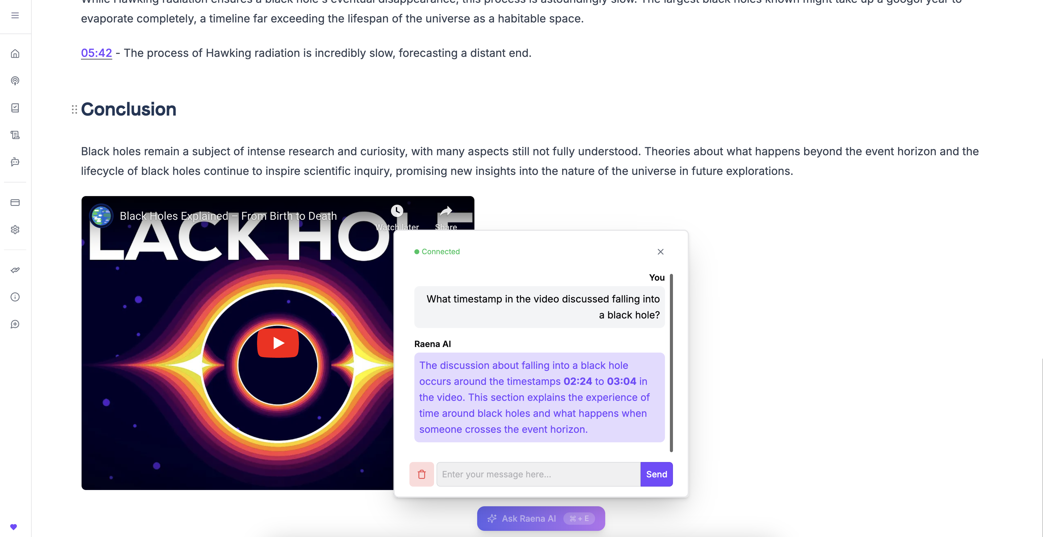 Unlock the power of conversation with your summaries using our new chat feature. Exclusively available to all Premium and Pro users, this tool opens a popup directly in your summary where you can consult with Raena AI about the materials provided, gaining deeper insights and clarity.